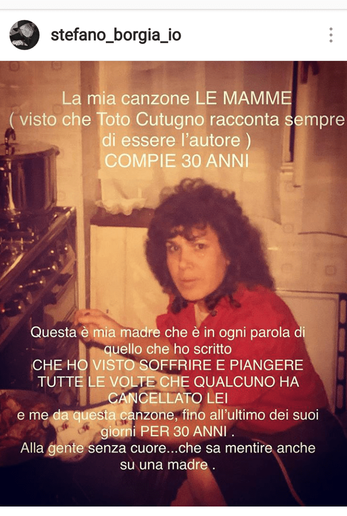 Già ma, direte voi, dov’è il problema in questo caso? Ebbene, a distanza di pochi giorni dall’esibizione con cui l’italiano vero per eccellenza ha dedicato il brano a tutte le mamme, alza la voce Stefano Borgia, in una dichiarazione a Radio Radio e a Grazia Maria Coletti sulle pagine de Il Tempo: “Toto racconta in tv in ogni occasione, sul web, ai giornali, che questa canzone l’ha scritta solo lui per la madre scomparsa ma non è così, e persino sul sito ufficiale sotto il testo si firma come unico autore omettendo di fare il mio nome in ogni occasione. Ma questo ricordo di mia madre dopo tanti anni mi ha spinto negli ultimi giorni a chiedergli di fare il mio nome almeno nella trasmissione Ora o mai più, di citarmi come autore, come sarebbe giusto fare dopo 30 anni … per WhatsApp Toto mi ha risposto che l’avrebbe fatto, ma anche stavolta Toto si è appropriato del mio testo e della mia musica”. E sul suo profilo Instagram Borgia rincara la dose con questa foto, che viene commentata anche da Giorgia così: ‘Onore al merito’.