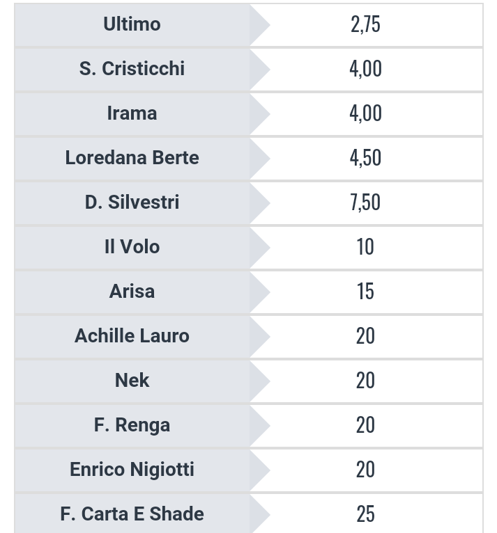 Ultimo è il favoritissimo dalla vigilia di questo Festival, dove le quote Snai sono rimaste più o meno identiche, a eccezione di Cristicchi, cresciuto fino a diventare l’outsider insieme a Loredana Bertè dopo le ovazioni del pubblico e dopo il supporto di ieri sera di Ermal Meta. La sensazione è che la Bertè, al suo ultimo Festival dichiarato, entrerà nella storia, mentre Ultimo se la dovrà vedere con quella giuria di qualità che ieri sera ha deluso tutti per l’indecoroso utilizzo del privilegio del voto. Silvestri e Il Volo potrebbero essere le scommesse di chi vuole tentare la fortuna affidandosi proprio agli Esperti che potrebbero fare gruppo su un solo cantante per dargli tutti i voti e farlo vincere,come accaduto ieri. Per questo sembra fin eccessiva la quota oltre 25 che riguarda Motta. Come si evince dalle quote, è lontanissimo dai favoriti il bravissimo Nigiotti che ricorda il suo Nonno Hollywood con tanta emozione, ma in un Sanremo così ricco di belle canzoni, qualcuna deve necessariamente rimanere fuori dal podio. Potrebbe accadere anche a Irama, che ha una delle canzoni più belle di sempre con un bellissimo coro gospel. Va ricordato che in hit Parade sono bastati due giorni a Ultimo e Irama per arrivare nei primi posti: la gente vuole loro.