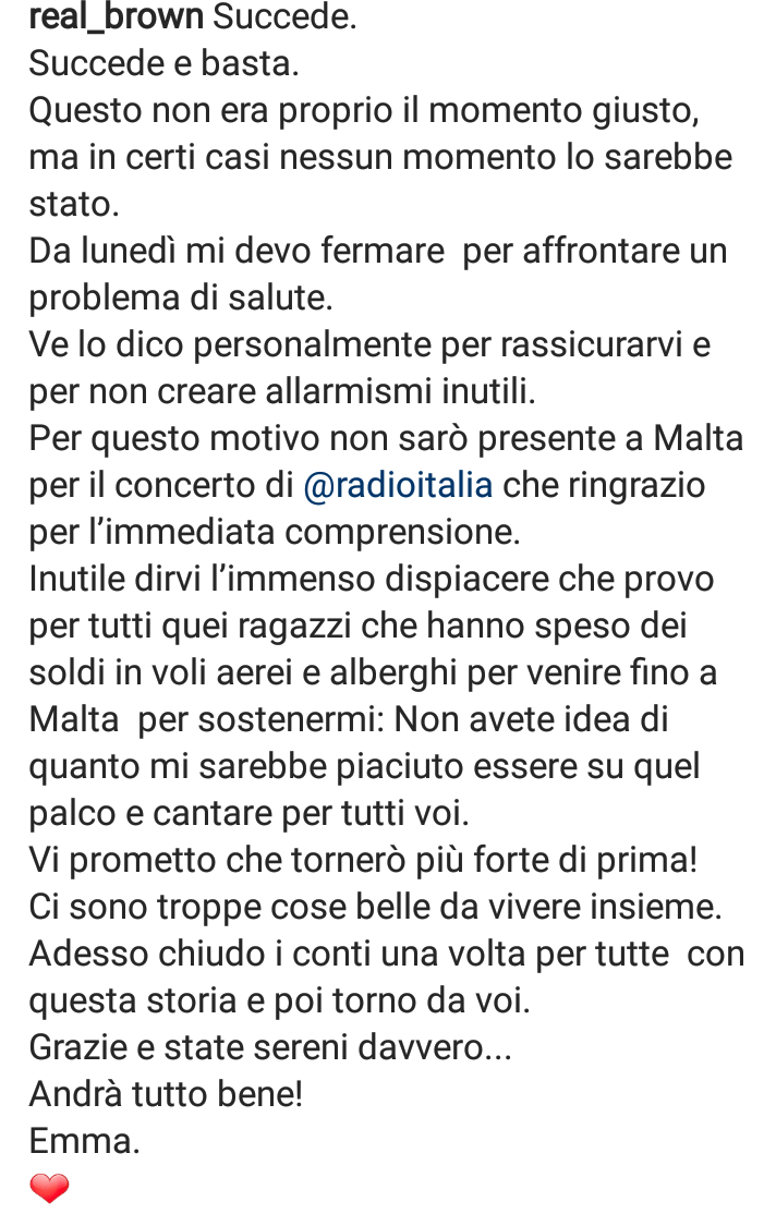 Fatalista e ottimista. Così appare giustamente la cantante salentina, a cui facciamo il più grande in bocca al lupo per rivederla presto sul palcoscenico! Forza Emma!