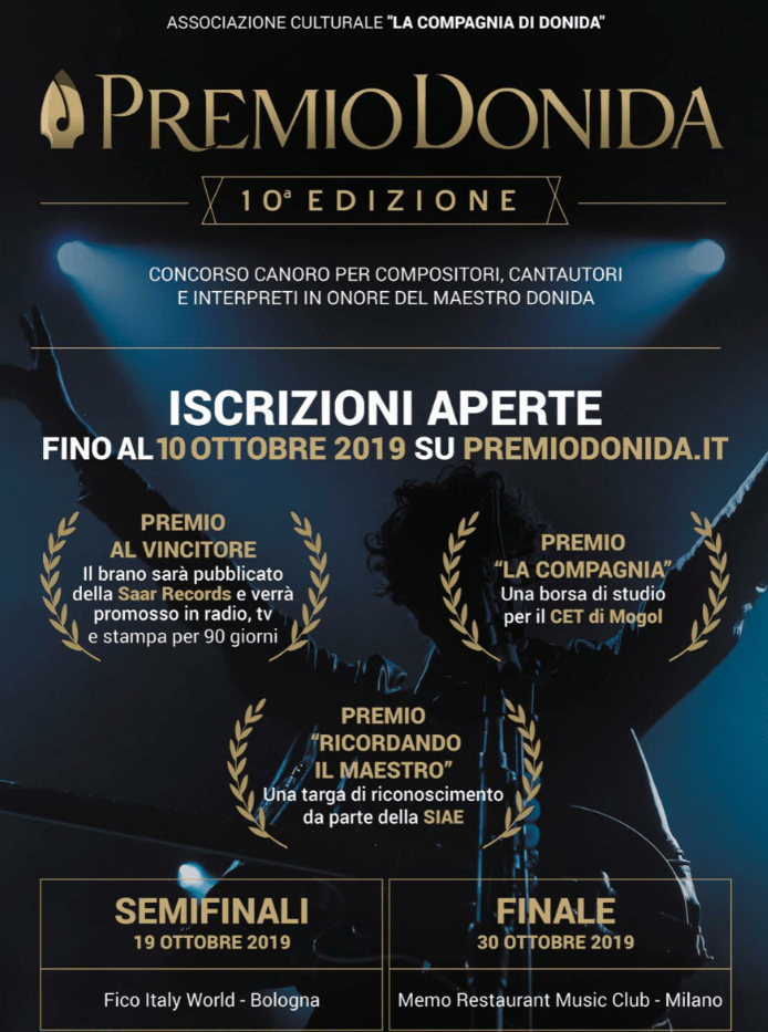 Fino al 10 Ottobre 2019 sono aperte le iscrizioni alla X edizione del PREMIO DONIDA, concorso musicale dedicato al ricordo del Maestro Carlo Donida Labati, autore di numerosi successi della musica italiana e collaboratore, a lungo, di Mogol. Il Premio è finalizzato a trasmettere messaggi di carattere culturale e artistico di esempio per i giovani.
