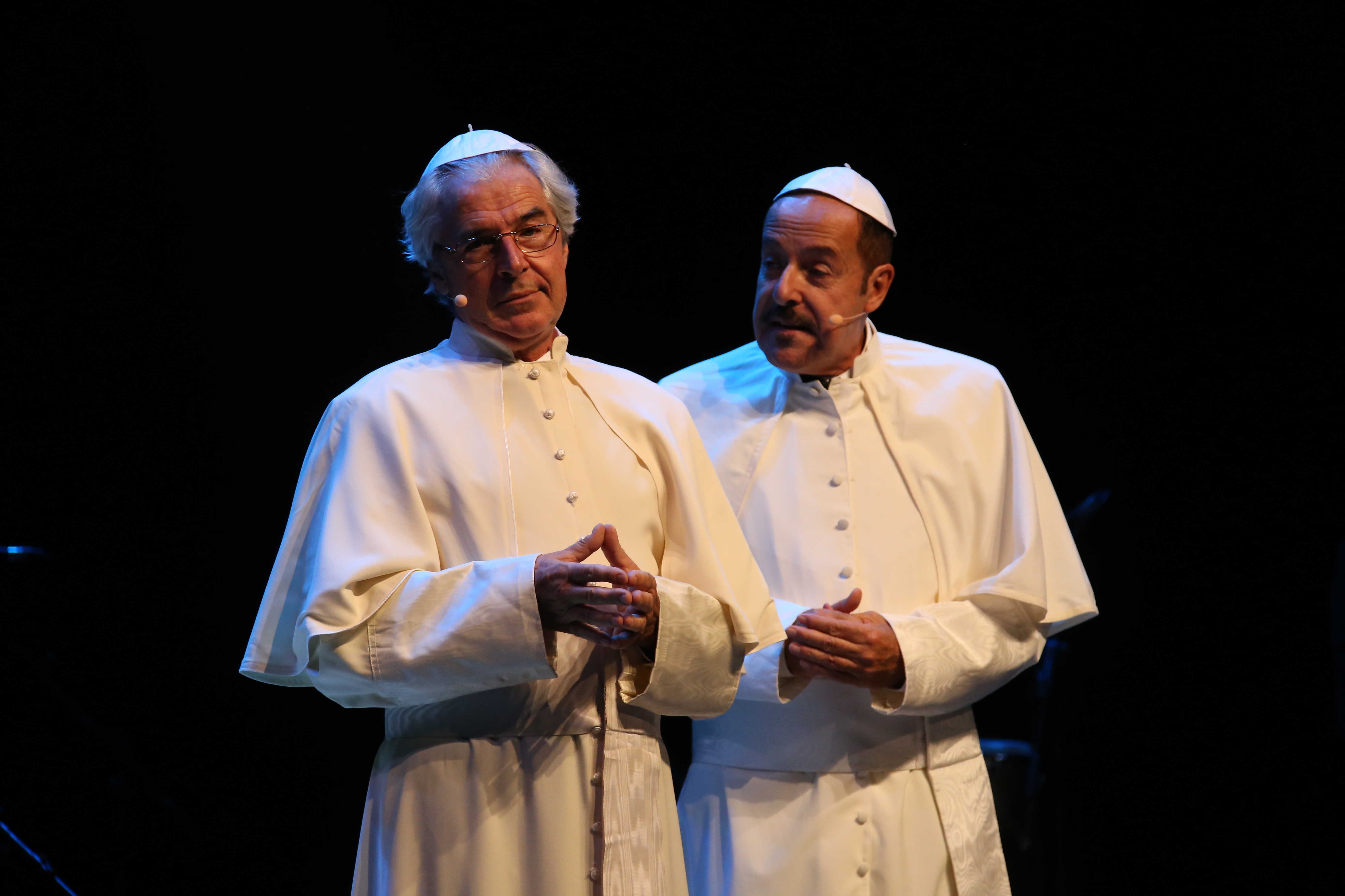 E nel politically uncorrect si ride sempre tantissimo, al punto che anche senza trucchi o maschere, nel volto baffuto di Lopez si vede in realtà la splendida Patty tirata a lucido che dimentica le parole, e con il finto Baudo sul palco sembra proprio di tornare a quel famoso Fantastico 6dove i due erano comici fissi insieme a Anna Marchesini. C’é anche lei sul palco, si avverte la presenza e non è difficile immaginarmi la sua risata quando vede i due amici divertirsi e divertire così il pubblico, come quando Solenghi parte cantando Ti lascio una canzone e all’improvviso Lopez canta con la voce e i tic identici a Ornella Vanoni. E così c’é un emozione che pervade il teatro nell’omaggio ad Anna, la loro grande compagna e amica del Trio. Sul palco infatti, come dicono loro stessi, non ci sono due attori, colleghi: ma due amici. Che ridono, scherzano e si divertono a immaginare l’impossibile: Ratzinger e Bergoglio insieme che guardano la tv! E poi tanta musica, bella, intonata: il varietà è tornato e vive più che mai!