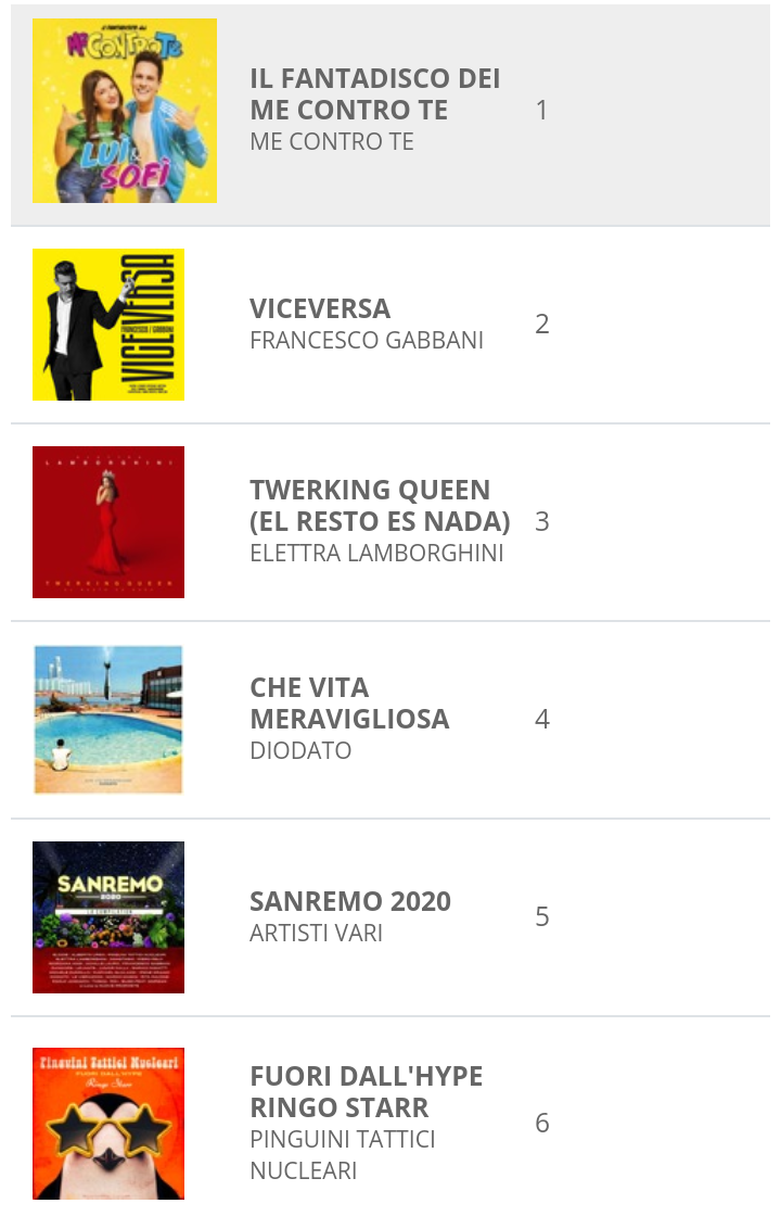 Esattamente, Elettra Miura Lamborghini. È lei il fenomeno indiscusso del Festival, con la sua allegria e la sua autoironia. Al quinto posto nella classifica dei singoli più venduti e scaricati troviamo proprio la sua Musica e il resto scompare, che del resto la lancia prepotentemente anche nella classifica degli album, dove è terza subito dietro a Gabbani e davanti a Diodato. Come sempre un ottimo riscontro anche per la compilation che contiene tutti in brani in gara in questa edizione. La vera gara è solo appena cominciata: ieri è uscito l’album di Piero Pelù, che si preannuncia come un possibile rivale per le zone alte della classifica, proprio come accaduto all’Ariston. Questo Sanremo 2020 è terminato da due settimane, ma fa notizia più di tutti gli altri.