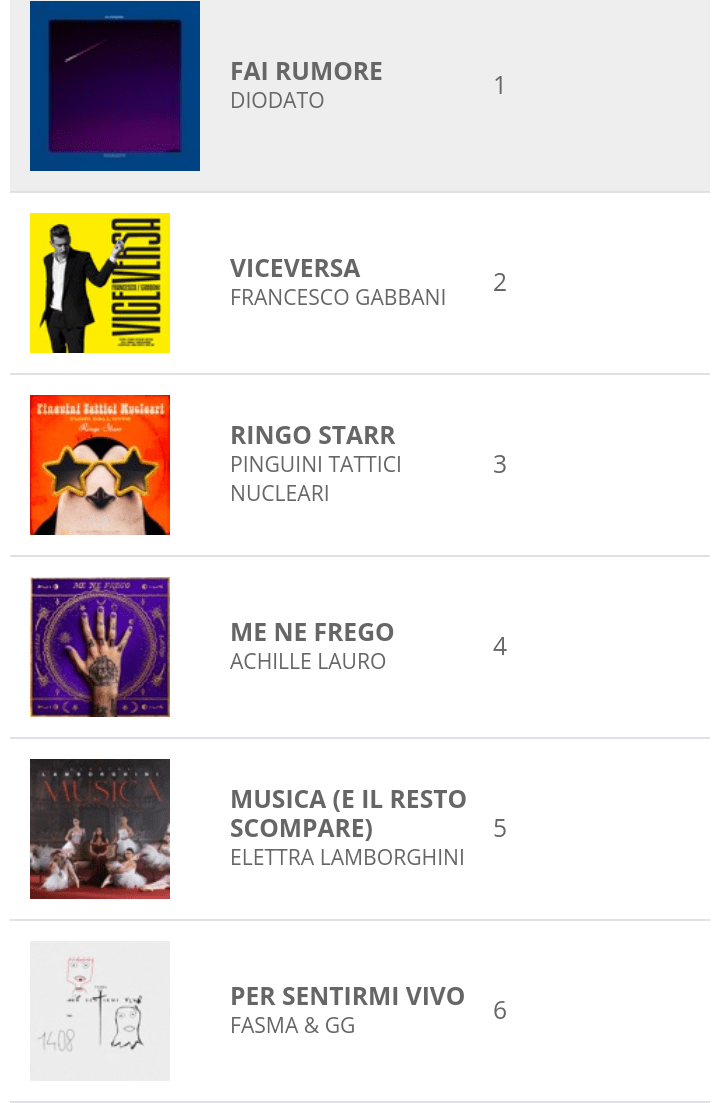 Ecco, la musica. Quella che dovrebbe essere il vero argomento di Sanremo. Le nuove canzoni stanno spopolando in radio e nelle classifiche, dove regnano tra gli album e i singoli nelle prime sei posizioni confermando di fatto il dualismo tra Diodato e Gabbani (primo anche nei vinili). Il vincitore del Festival, con Fai rumore, è primo nella classifica Fimi dei singoli della settimana dal 14 al 20 febbraio, tallonato sempre dal cantante toscano con Viceversa. Nei brani più scaricati troviamo anche Ringo Starr dei Pinguini Tattici Nucleari, Me ne frego di Achille Lauro e Per sentirmi vivo del giovane Fasma, autentica rivelazione. Ma la sorpresa più grande (forse) è lei.