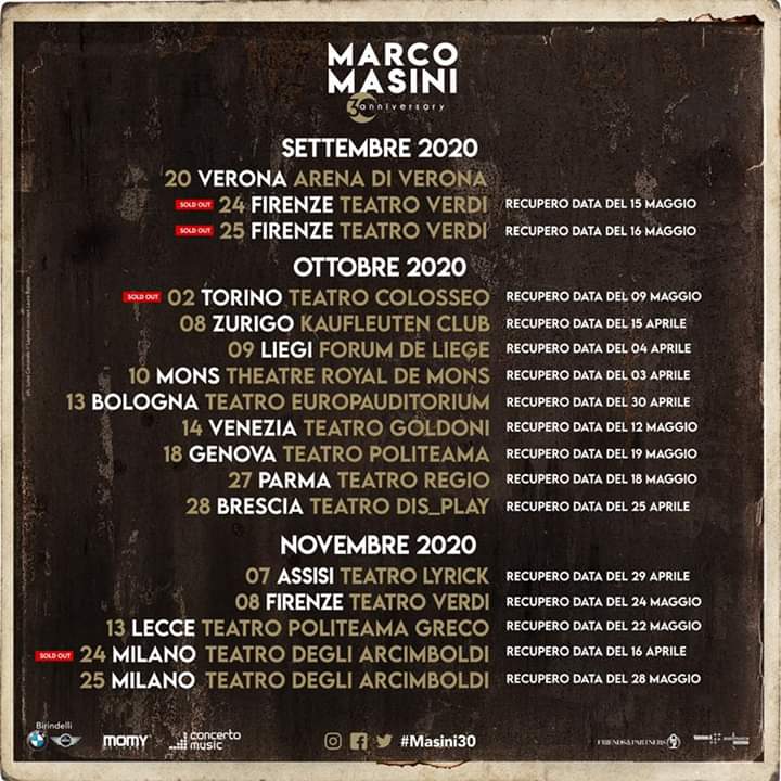 Le nuove date milanesi del concerto saranno, sempre agli Arcimboldi, il 24 e il 25 novembre. Di seguito ecco tutte le altre date di recupero del tour con cui il cantautore toscano festeggia 30 anni di carriera.