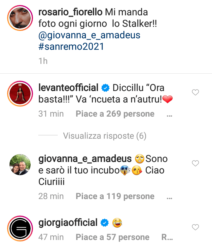 Tra i commenti, oltre a quelli divertiti di Levante e Giorgia, ecco quello dello stesso Amadeus: Sono e sarò il tuo peggior incubo!