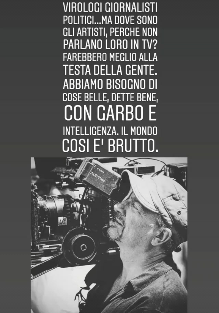 Virologi, giornalisti, politici…ma dove sono gli artisti, perché non parlano loro in tv? Farebbero meglio alla testa della gente. Abbiamo bisogno di cose belle, dette bene, con garbo e intelligenza. Il mondo così è brutto.