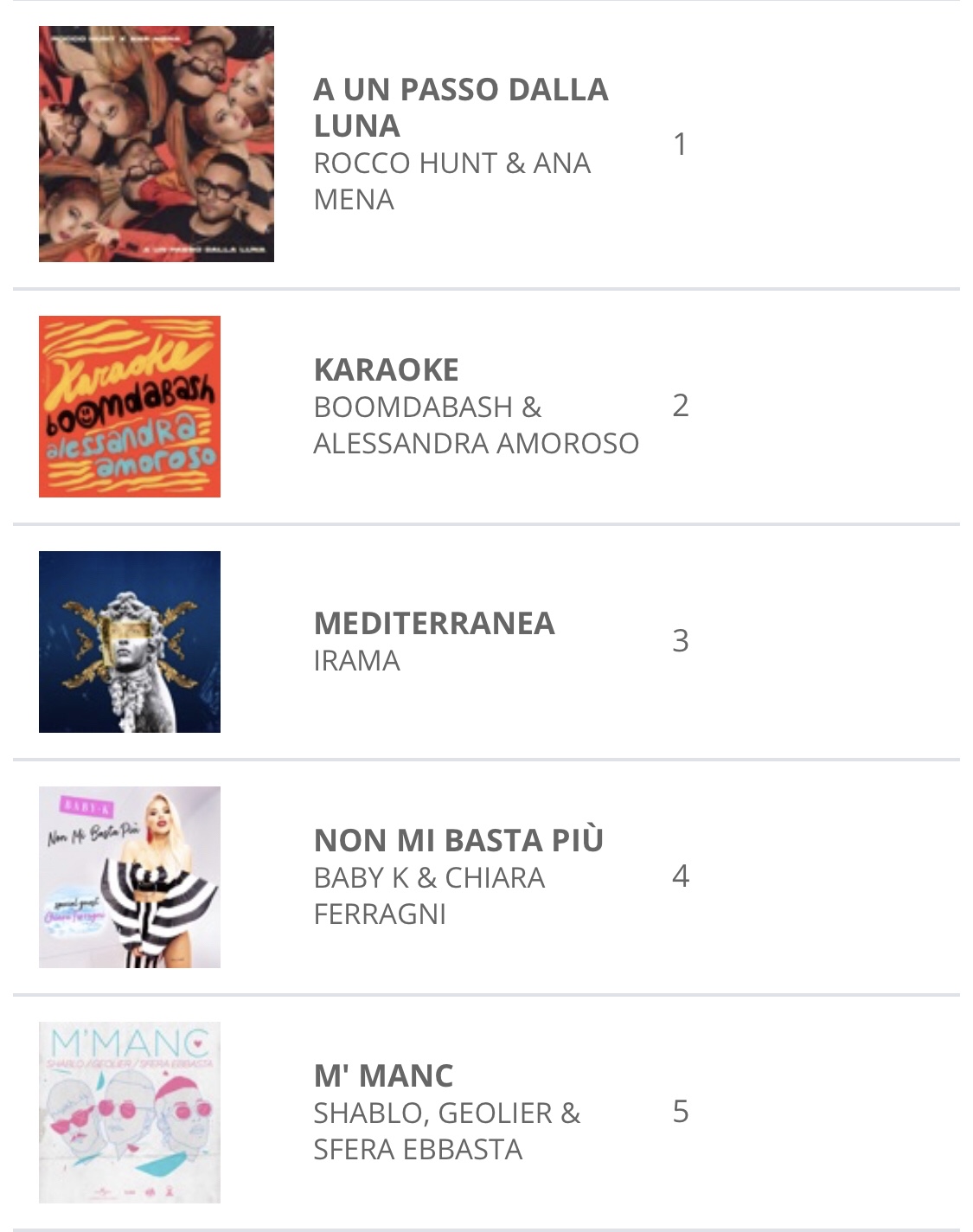 Agosto, eccoci al giro di boa dell’estate più anomala e più strana di sempre. Quella che non sa bene come fare i conti con il Covid, ma ha voglia comunque di divertirsi e ballare. Dopo un giugno sotto il segno di Irama e Mediterranea, un mese di luglio all’insegna di Alessandra Amoroso e Boomdabash con la loro Karaoke, eccoci alla svolta. La rimonta di Rocco Hunt è completata, e da ieri è il giovane cantautore napoletano a guidare le Classifiche Fimi dei singoli più venduti nella settimana. Dopo una partenza in sordina, A un passo dalla luna diventa così il nuovo tormentone, quello probabilmente destinato ad accompagnarci più di ogni altro nel prossimo mese. I primi cinque posti sono comunque sempre ad appannaggio dei soliti da ormai varie settimane: dietro Rocco Hunt, infatti, proprio Karaoke e Mediterranea. Quarto posto solido in classifica per Baby K con Chiara Ferragni (Non mi basta più). Quinta posizione per M’manc. Ancora tabù per Giusy Ferreri ed Elettra Lamborghini, che non convincono le classifiche nonostante il brano frizzante e ballabile. Solo ottavo Fedez con Bimbi per strada.