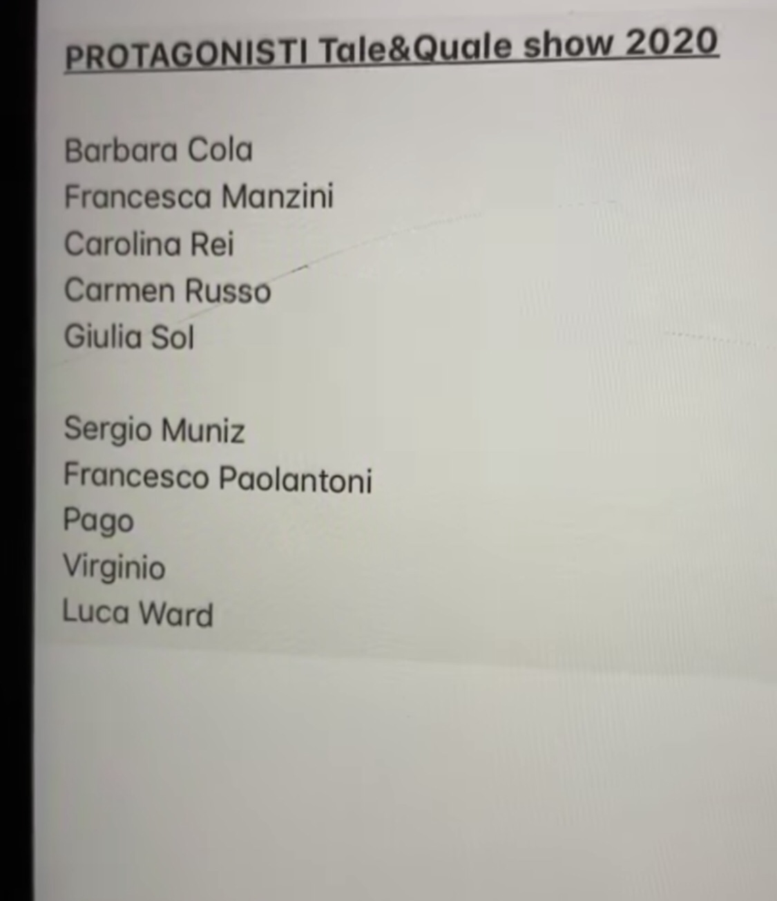 A sorpresa ecco Luca Ward, Francesco Paolantoni e Sergio Muniz. Completano il cast l‘imitatrice Francesca Manzini, la conduttrice Carolina Rei, la cantante jazz Giulia Sol e il cantante Virginio. Tanti artisti quindi che, tra imitazioni e musica, sembrano avere già una marcia in più per partecipare alla decima edizione dello storico varietà del venerdì sera.