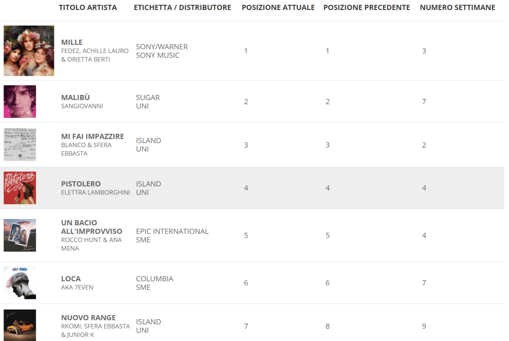 Continua a reggere molto bene Elettra Lamborghini con la sua Pistolero, davanti di un soffio rispetto a Rocco Hunt, che non ha confermato solo l’accoppiata con la bravissima Ana Mena, ma ha praticamente ribadito la canzone dell’anno scorso: Un bacio all’improvviso è sostanzialmente il naturale proseguimento di Un passo dalla luna.