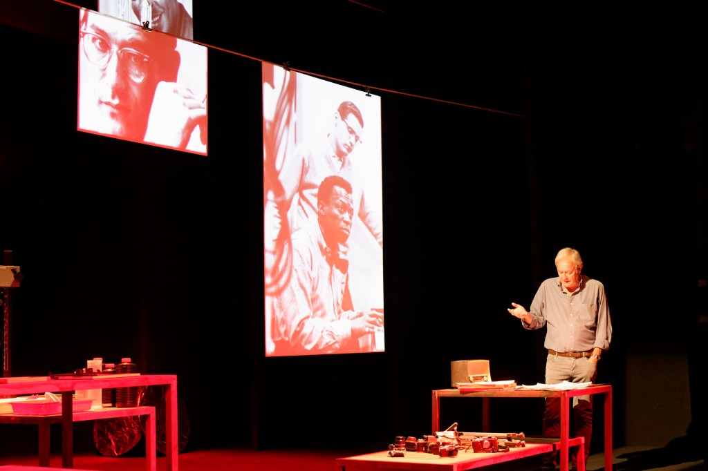 Il fotografo-Tedeschi, in uno spazio scenico che rimanda alla camera oscura in cui