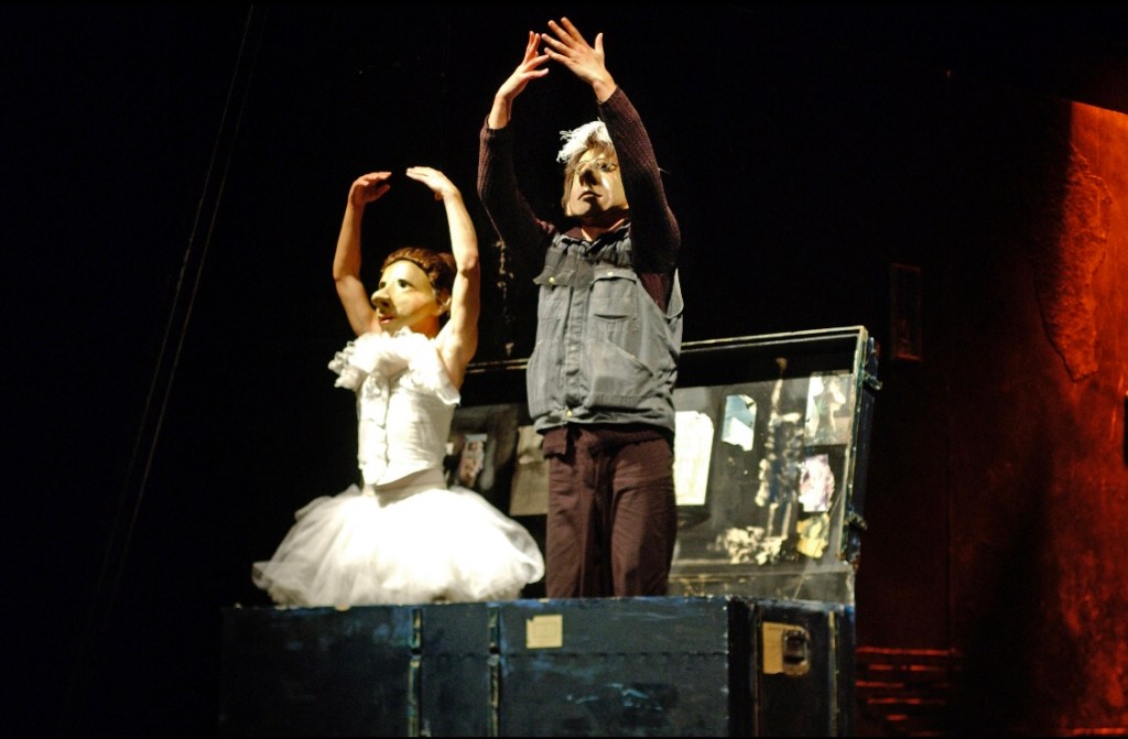 TEATRO DELUSIO è teatro nel teatro. L’inquietante vivezza delle maschere, le fulminee trasformazioni ed una poesia tipicamente Flöz trascinano il pubblico in un mondo a sé stante, un mondo carico di misteriosa comicità. Con l’aiuto di costumi raffinati e di suoni e luci ben concepiti, i tre attori mettono in scena 29 personaggi e danno vita ad un teatro completo.