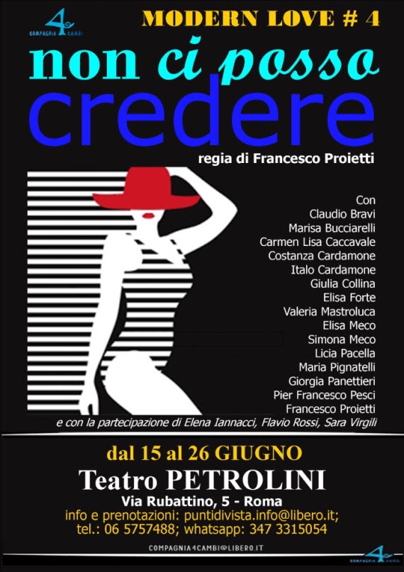 Arriva dal 15 al 26 giugno al Teatro Petrolini, via Rubattino a Roma, il quarto appuntamento dello spettacolo Modern Love #4 – Non ci posso credere di Francesco Proietti ed interpretato dalla protagonista Elisa Forte insieme con Claudio Bravi, Marisa Bucciarelli, Carmen Lisa Caccavale, Costanza Cardamone, Italo Cardamone, Giulia Collina, Valeria Mastroluca, Elisa Meco, Simona Meco, Licia Pacella, Maria Pignatelli, Giorgia Panettieri, Pier Francesco Pesci, Francesco Proietti e con la partecipazione di Elena Iannacci, Flavio Rossi e Sara Virgili.