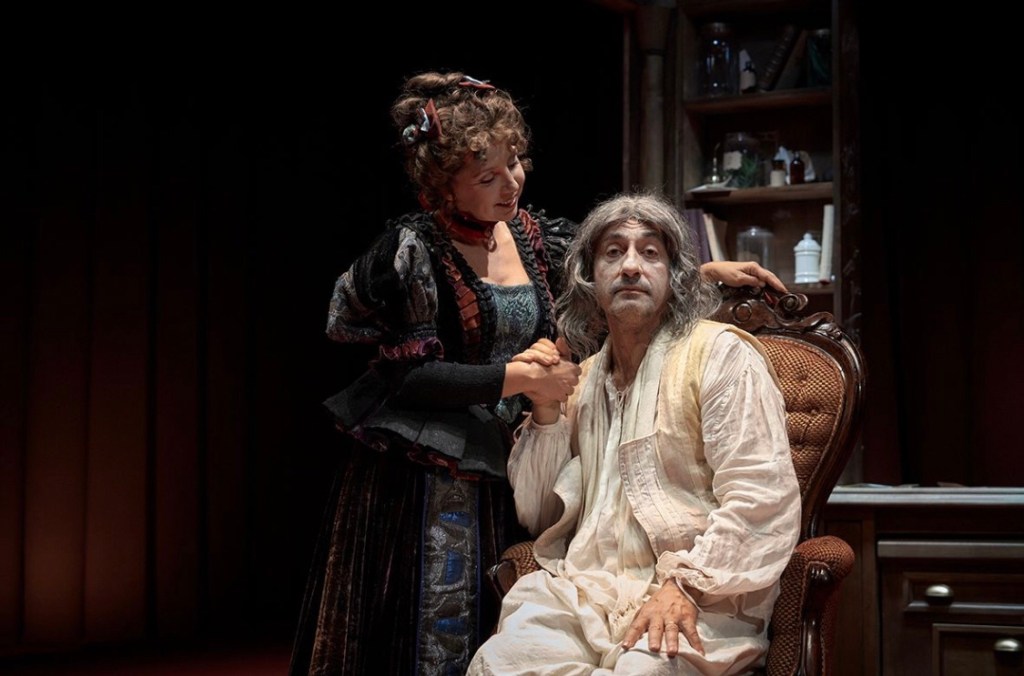 Non è solo la prima volta, dopo tanto tempo, che il malato immaginario è ancor più comico in quanto interpretato da un attore giovane. Emilio Solfrizzi dona personalità a un personaggio talmente conosciuto e iconico da essere ormai una maschera. Così, è anche la prima volta che si vede un Argante con un’inflessione pugliese capace di rendere la storia ancor più vera. Non bastassero le sue consuete smorfie con cui sa parlare anche senza aprire bocca, l’attore barese è talmente coinvolgente che riesce persino a rendere “vivi” i fantocci con cui dialoga sul finale. Solfrizzi, acclamato trionfalmente, si conferma straordinario mattatore da conservare sotto chiave, perché è grazie ad attori come lui che il teatro sa essere colto e divertente allo stesso tempo. Ha un pregio indiscutibile: ogni volta che lo si vede sul palcoscenico, si riconosce la sua voglia di giocare. Non solo: chiede l’applauso finale per tutta la compagnia di attori, rimarcandone il grande lavoro svolto. Anche per essere capitani di una squadra, bisogna saper interpretare la vita con la dovuta generosità, che non appartiene a tutti in questo mondo.