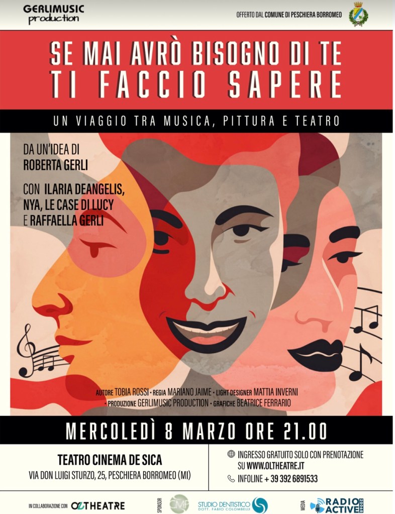 Oggi mercoledì 8 marzo 2023, al Teatro De Sica a Peschiera Borromeo (MI) alle ore 21, andrà in scena Se mai avrò bisogno di te ti faccio sapere, uno spettacolo ideato e prodotto da Roberta Gerli (GerliMusic Production) e offerto dal Comune di Peschiera Borromeo. La regia è affidata al giovane e talentuoso Mariano Jaime, la drammaturgia è di Tobia Rossi, le luci e i Visual del light designer Mattia Inverni. Le protagoniste di questo “viaggio” tra musica, pittura e parole, sono l’attrice Ilaria De Angelis, le cantautrici Nya, Le case di Lucy e la pittrice Raffaella Gerli.
