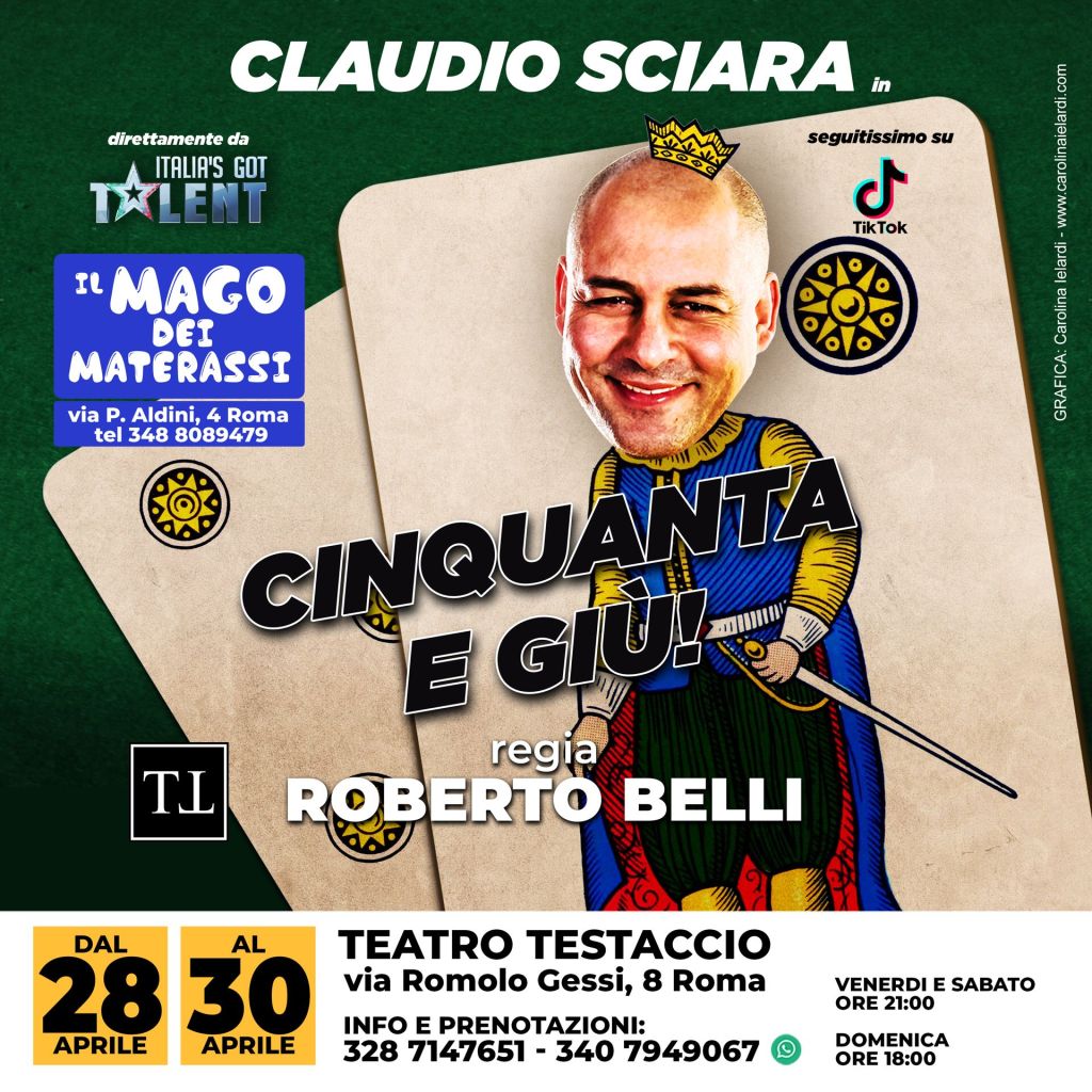 La ricetta giusta per ritrovare il buonumore? Affidarsi alla terapia del sorriso, una vero toccasana per la salute. Lo sa bene il comico Claudio Sciara che ha deciso di sposare questa filosofia di vita, consapevole di quanto il potere di una risata possa davvero aiutare la mente e il corpo. Ed è così che l’artista si racconta nel suo nuovo spettacolo “50 e giù”, in scena dal 28 al 30 aprile 2023 presso il Teatro Testaccio di Roma (via Romolo Gessi) con il quale intende fare un bilancio della sua esistenza, riletta in chiave ironica e divertente.