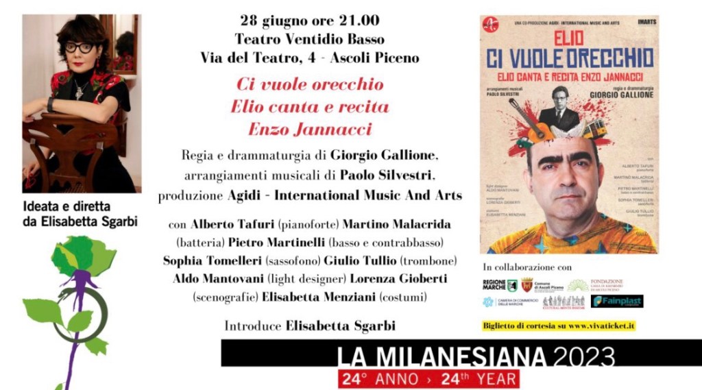 LA MILANESIANA, ideata e diretta da Elisabetta Sgarbi, dopo il successo della scorsa edizione, torna anche quest’anno al Teatro Ventidio Basso di Ascoli Piceno, mercoledì 28, giovedì 29 e venerdì 30 giugno con imperdibili spettacoli che inizieranno alle ore 21.00 e saranno introdotti da Elisabetta Sgarbi.