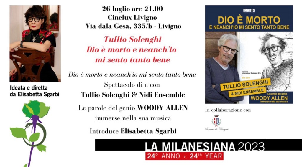 Il terzo e ultimo appuntamento in programma al Cinema Cinelux si terràmercoledì 26 luglio con “Dio è morto e neanche io mi sento tanto bene”, lo spettacolo di e con TULLIO SOLENGHI & NIDI ENSEMBLE. (A questo link la nostra recensione). Lo spettacolo vede sul palco TULLIO SOLENGHI impegnato con la lettura di alcuni testi di Woody Allen(autore recentemente pubblicato da La nave di Teseo), coniugati con le musiche che hanno caratterizzato i suoi film più significativi, eseguite dal MaestroALESSANDRO NIDI e dal suo ENSEMBLE. Si passerà così dai “Racconti Hassidici” alla parodia delle Sacre Scritture tratti da “Saperla Lunga” allo spassoso “Bestiario” tratto da “Citarsi Addosso”, intervallati da brani di George Gershwin, Tommy Dorsey, Dave Brubeck, con uno speciale omaggio al mentore di Woody, il sommo “GrouchoMarx”, evocato dalla musica Klezmer. Una serata in cui, in rapida carrellata, si alterneranno suoni e voci, musica e racconto in un’alternanza di primi piani a comporre un “montaggio” divertente e ipnotico.