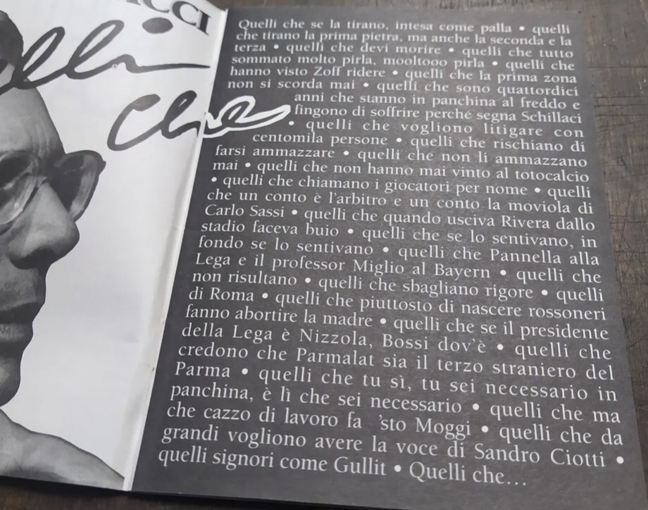 Ed ecco invece come si presentava la sigla di Quelli che il calcio. Come detto, il ritmo blues era l’unica costanza insieme all’incipit di ogni strofa, destinata a cambiare rapidamente, anche più di una volta nella stessa stagione. Ecco solo alcuni esempi di Quelli che…