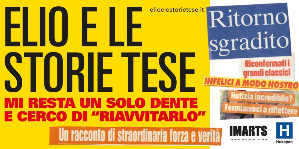 Sfiniti dal dover rispondere quotidianamente ad almeno 20 persone a testa che chiedono «Quando tornate insieme?» e «Ma non vi eravate sciolti?» (per non parlare del tasso), ELIO E LE STORIE TESE risolvono il problema tornando nei teatri dal 5 ottobre (anteprima il 30 settembre), diretti dal famoso regista Giorgio Gallione, con lo spettacolo “MI RESTA UN SOLO DENTE E CERCO DI RIAVVITARLO“.