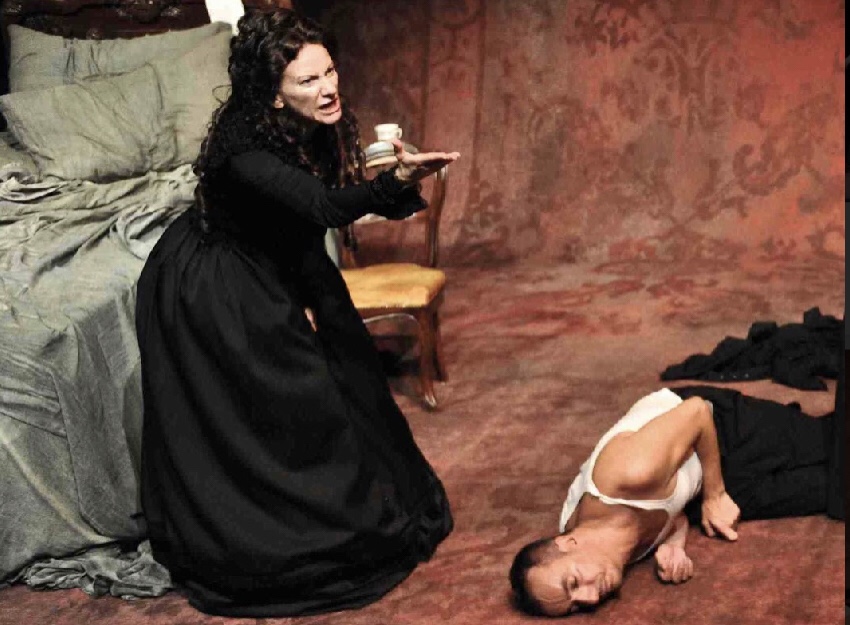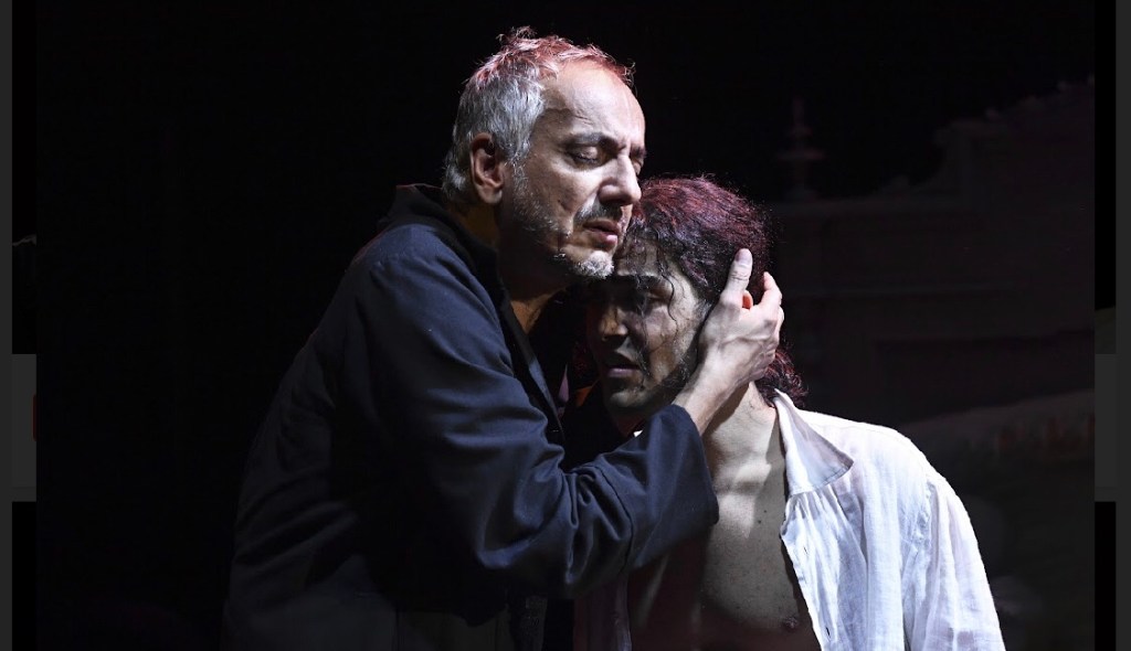 Una scena composta da un unico grande drappo che scende dall’alto e contiene il luogo dell’azione, un luogo claustrofobico in cui convivono tutti i personaggi, che vediamo spogliarsi, rivestirsi, incontrarsi (come in un film di Luis Bunuel). Personaggi rinchiusi in abiti scuri, monacali e preteschi, per devozione o lutto, ma forse solo per difesa. Illuminati da luci rivelatrici, come in un miracolo pagano, dove l’intimità delle note di un pianoforteconvivono con quelle sontuose e barocche di un organo.