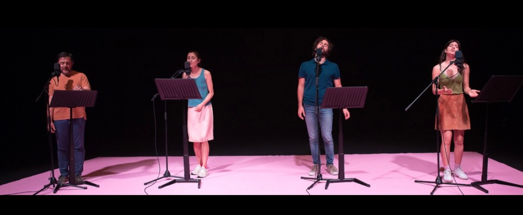 I quattro performer parlano, giocano, urlano, lottano, confessano segreti e fanno dichiarazioni d’amore. Voci che generano dinosauri e lupi, funghi e balenottere, madri, padri, figli e figlie, che solo per un attimo si trovano in quel tempo e in quello spazio, pronti a scomparire con l’evanescenza del fiato che si dissolve.