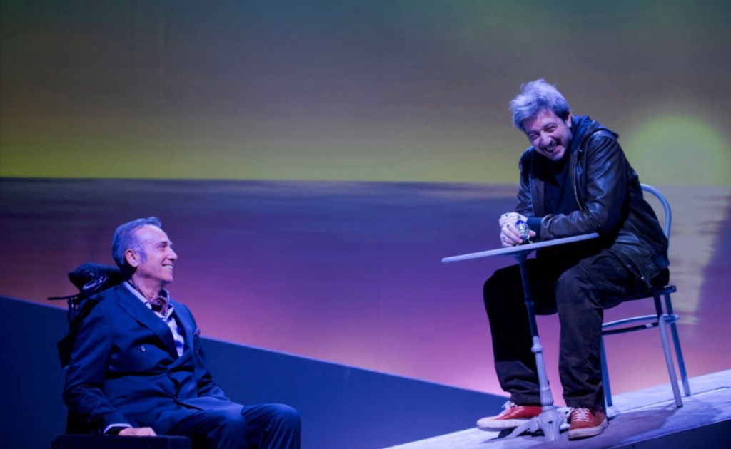 Tre ragazzi vestiti di tutto punto con abiti eleganti (nel ruolo degli aspiranti badanti) vengono battezzati così da Driss (Paolo Ruffini): “E voi chi siete, Il Volo?”. Così, non sono passati nemmeno due minuti dall’inizio dello spettacolo e già si ride comprendendo quale sarà il clima della serata. Ruffini è strepitosamente comico, scapestrato e intelligente da fare risaltare in modo perfetto il carattere colorato, esuberante ma anche profondo del suo personaggio. Coinvolgente anche quando balla: artista completo, con un talento a cui la tv non riesce a dare sufficientemente ragione. Massimo Ghini è interprete come sempre di un’eleganza inconfondibile anche nei momenti più divertenti: non scade mai nella volgarità nemmeno di fronte a un doppio senso. Va sottolineata la difficoltà di un ruolo recitato interamente con la sola testa, senza mai fare uso degli arti bloccati sulla sedia a rotelle. Applausi a scena aperta meritati per entrambi.