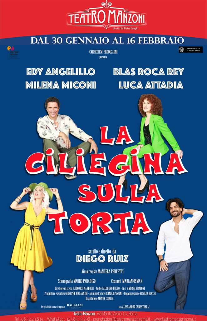 Una commedia sfacciata e piccante sulla famiglia e le sue innumerevoli dinamiche. Da giovedì 30 gennaio a domenica 16 febbraio arriva sul palco del Teatro Manzoni di Roma LA CILIEGINA SULLA TORTA, scritta e diretta da Diego Ruiz e interpretata da Edy Angelillo, Blas Roca Rey, Milena Miconi e Luca Attadia.