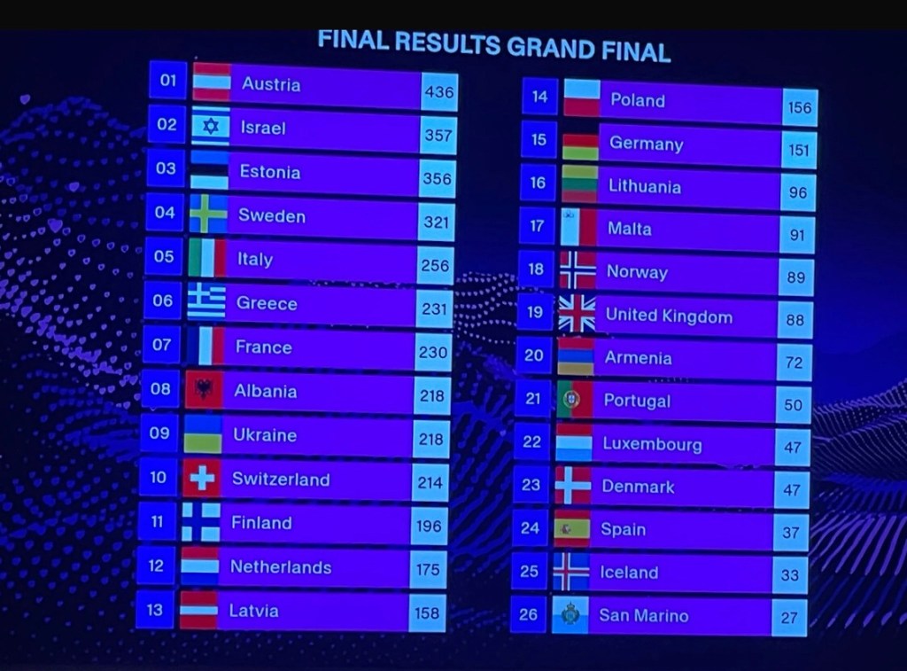 È l’Austria ad aggiudicarsi Eurovision Song Contest 2025, come da pronostico della vigilia secondo i bookmakers. JJ, con Wasted Love arriva primo davanti a Yuval Raphael (Israele) e alla rivelazione estone, Tommy Cash. Il giovane con la voce da soprano vince grazie al voto delle giurie. (Clicca qui per leggere le nostre pagelle divise tra prima e seconda semifinale)