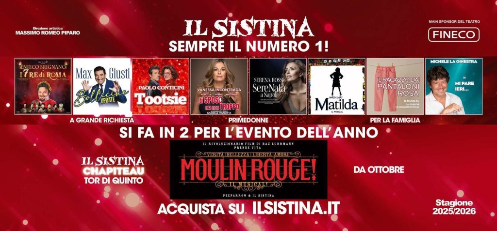 Il Teatro Sistina di Roma scalda già i motori per la prossima stagione. Dalle novità assolute come “Moulin Rouge! Il Musical” e “Il ragazzo dai pantaloni rosa” agli attesissimi ritorni di grandi mattatori come Enrico Brignano, Max Giusti, Paolo Conticini, fino a due Musical tra i più amati degli ultimi anni, come “Matilda sei mitica” -con protagonisti Sebastiano Somma e Roberta Lanfranchi- e “Tootsie“, a cui seguiranno tre mattatrici del calibro di Vanessa Incontrada, Rossella Brescia e Serena Rossi: il Teatro Sistina, da sempre numero uno per eccellenza e qualità, anche quest’anno si prefigge di raggiungere il bis dei numeri record della scorsa Stagione.