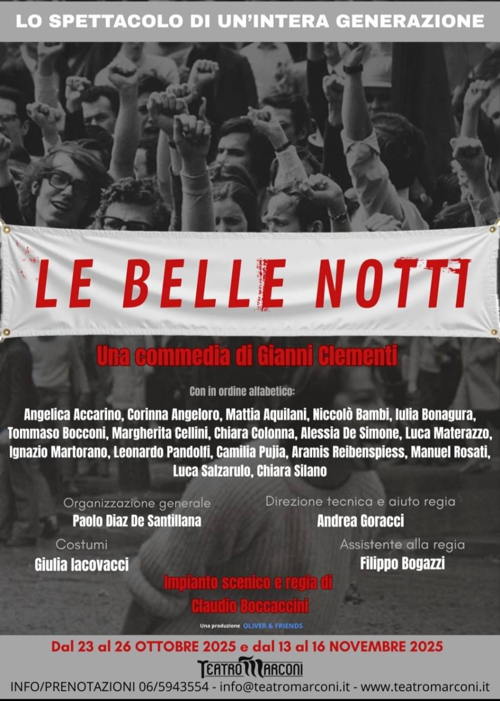 Dal 23 al 26 ottobre e dal 13 al 16 novembre va in scena, al Teatro Marconi di Roma Le Belle Notti, di Gianni Clementi, con la regia di Claudio Boccaccini e un cast nutrito di attori.
