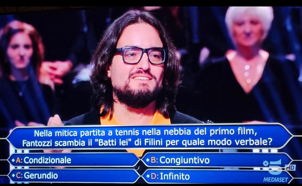La domanda recitava così: Nella mitica partita a tennis nella nebbia del primo film, Fantozzi scambia il “Batti lei” di Filini per quale modo verbale?