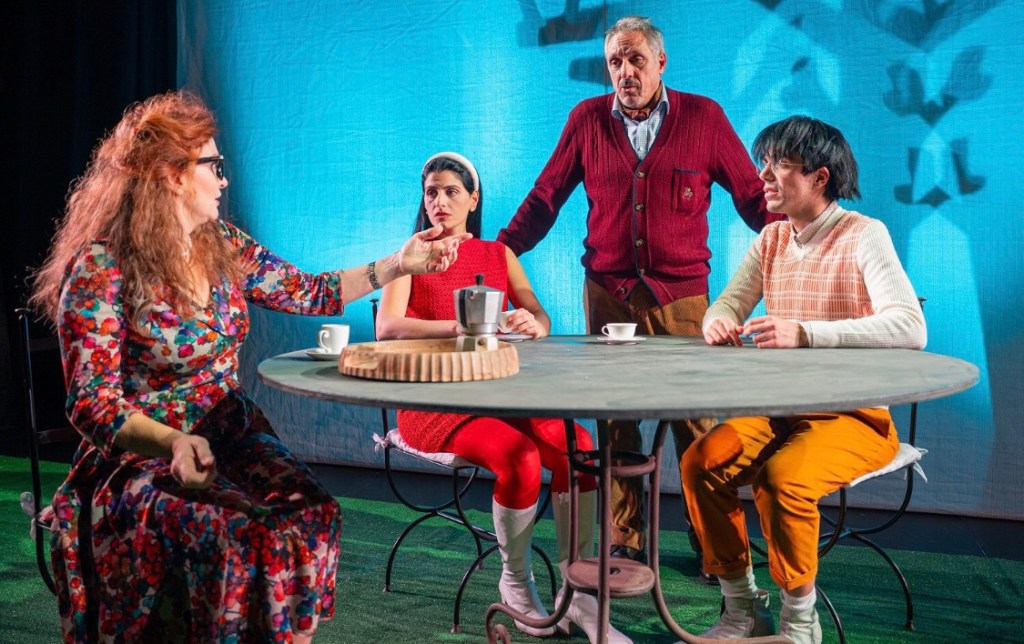 Una bella commedia degli equivoci, di quelle che non si diventa matti a seguire e non vengono trascinate per le lunghe. Negli anni ‘70 la interpretò Gino Cervi, ora assume ancor di più un certo fascino perché conserva l’ambientazione in quel periodo, con tanto di colonne sonore dell’epoca. Due scenografie: la prima, quella con cui viene accolto il pubblico all’ingresso, riecheggia musicarelli e band anni ‘60. A questo si aggiunga una regia cinematografica e poetica allo stesso tempo. Si è inseriti una cornice affascinante, a cui i litigi tra le coppie e i presunti tradimenti fanno da contraltare spiazzando ogni volta. In effetti anche il pubblico, che sa di essere di fronte ad equivoci, continua a rimanere sorpreso, perché di scontato non c’è nulla in questa storia divertente, leggera e scorrevole. Il colpo di scena finale non manca.